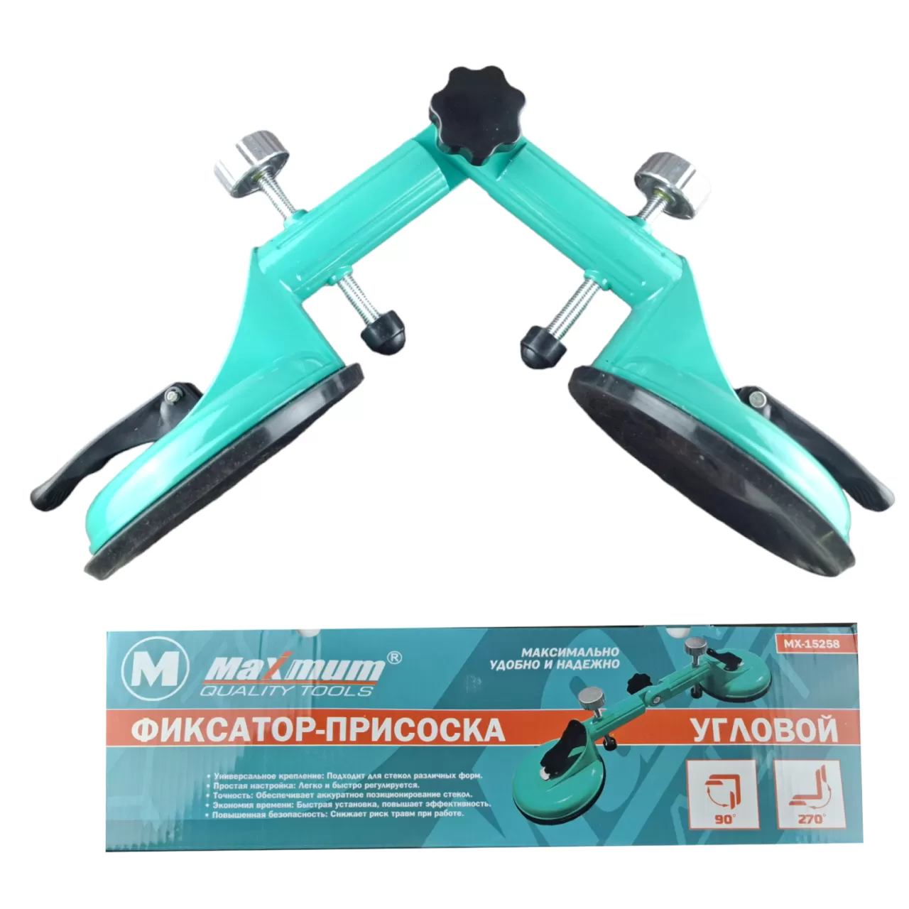 Угловой стеклодомкрат с двойной присоской предназначен для фиксации, подъема и транспортировки стекол, зеркал, плитки и других изделий и материалов с плоскими гладкими поверхностями. Специальный регулировочный винт на рукоятке позволяет сгибать конструкцию и регулировать угол и растояние между резиновыми тарелками. Две присоски диаметром по 120 мм фиксируются с помощью рычагов. Конструкция создана из алюминия и покрыта краской, которая предотвращает появление царапин и коррозии.